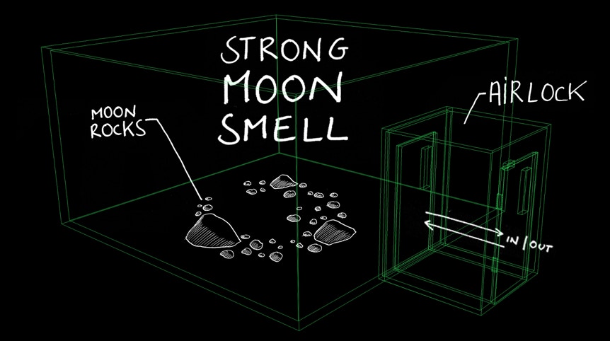 Based on their research and the reports of the Apollo astronauts, Pearce manufactured a smokey smell redolent of spent fireworks or burned metal.